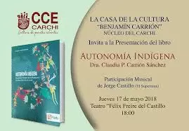 La Casa de la Cultura Ecuatoriana invita a la presentación del libro 'Autonomía Indígena' de Claudia Patricia Carrión Sánchez, en el Teatro Félix Freire, este jueves 17 de mayo, a las 18:00. Entrada libre.