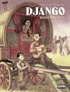 EL NACIMIENTO DE UNA LEYENDA DEL JAZZ Django Reinhardt, creador del jazz manouche, es considerado por muchos el mejor guitarrista de la historia. Pero no todo el mundo sabe que, de pequeño, Django sufrió un accidente que le hizo perder la movilidad de dos dedos de su mano izquierda, tan importante para un guitarrista. ¿Cómo se convirtió un niño de un humilde poblado de caravanas en uno de los músicos más importantes del s. xx? Salva Rubio -El fotógrafo de Mauthausen- y Ricard Efa -Sola-, que ya nos deslumbraron con Monet: nómada de la luz, nos narran ahora una apasionante historia de autosuperación que supone el nacimiento de una leyenda surgida de entre las llamas: Django, mano de fuego